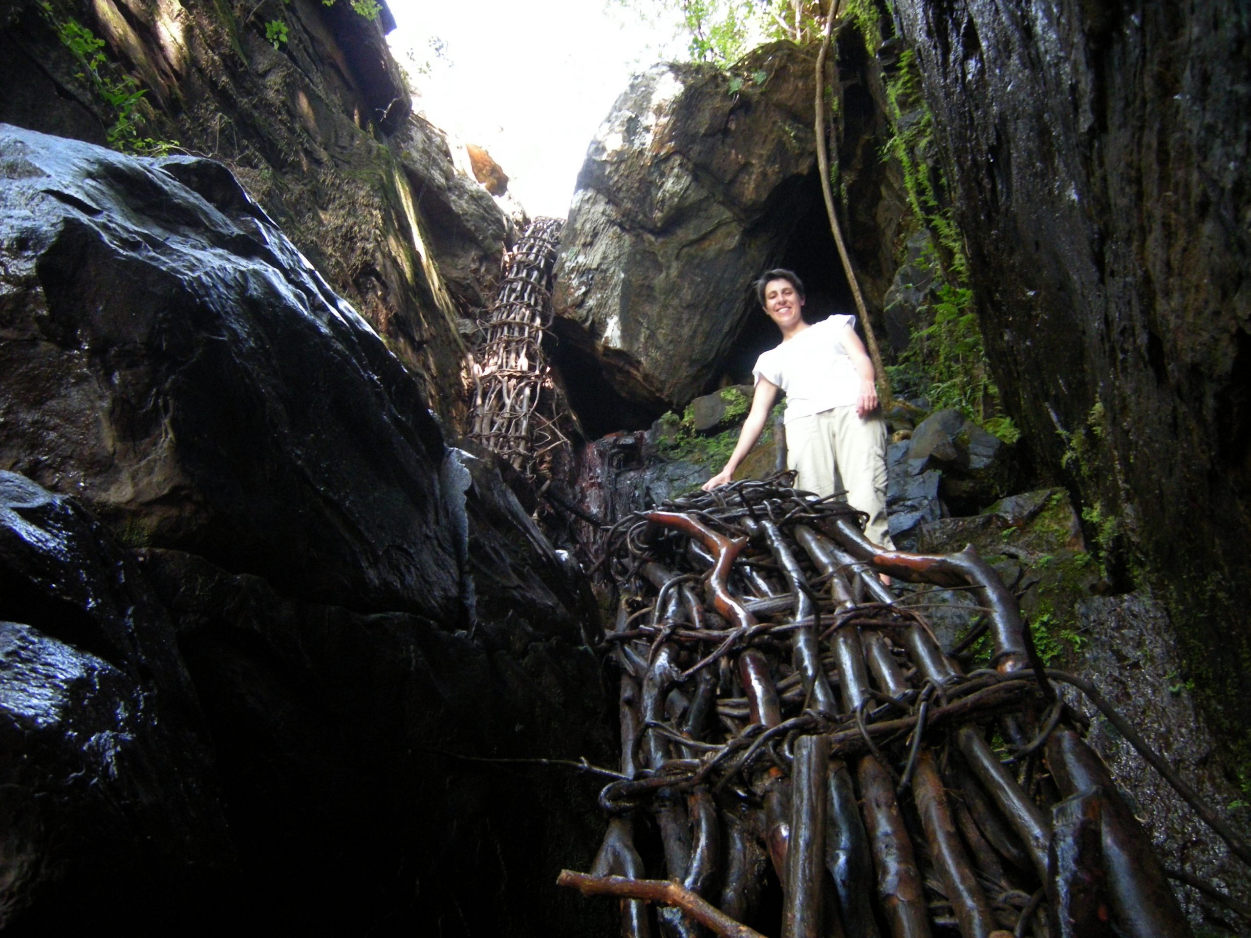 Puis, enfin on arrive aux échelles. Des bois sont effectivement assemblés avec des lianes entre les roches, au quasi verticale. Des lianes tous les 30 – 50 cm simulent des échelons. De l’eau suinte à droite et à gauche.